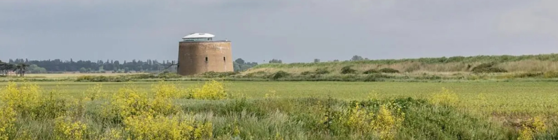 This unique quatrefoil Martello Tower stands at the isthmus leading to the Orford Ness shingle spit. It is the largest and northernmost of 103 English defensive towers built in 1808–1812 to resist a threatened Napoleonic invasion. The Landmark Trust now runs it as holiday apartments.